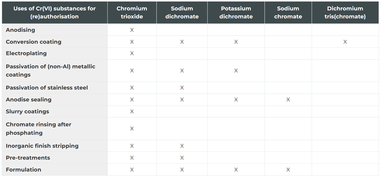 The substance/use combinations covered in the first tranche of submissions by the ADCR are shown in the table below. To support the requested review periods, the applications define more clearly each of the substance uses in terms of the actual conditions of use, as well as the associated worker and environmental exposures to the chromates.